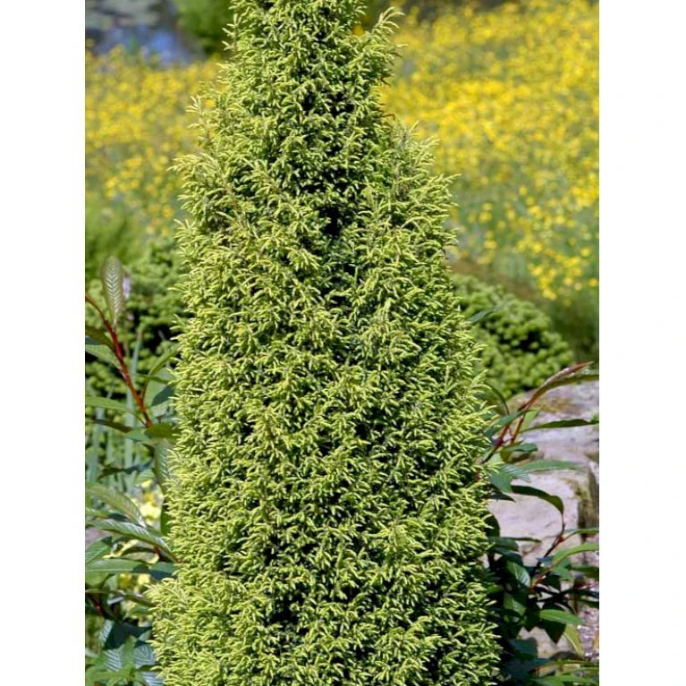 Stedsegrønt nåletræ som bliver op til 2 m højt. Denne sort er smal, søjleformet i sin vækst. Nålene er gulgrønne. Hårdfør, vindfør, sund og robust. Placeres som baggrund i havens bede i almindelig havejord. Det er en fuldt ud hårdfør plante til det danske klima. Planten kræver mellem gødning.