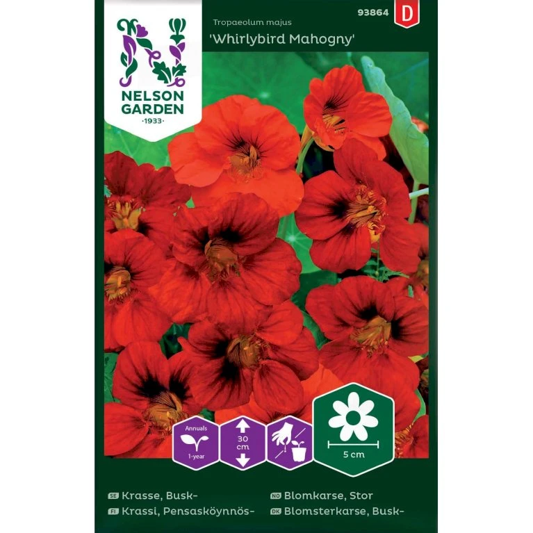Halvfyldte, propellignende rødbrune blomster på lave, buskede planter. Glimrende i bede og krukker. Blomsterne er spiselige og dekorative i salater. Blomstrer bedst i mager, veldrænet jord. I alt for næringsrig jord udvikles bladene på bekostning af blomsterne. Frisk farveplet i haven eller på altanen. Læg frøene i blød et døgn i lunkent vand før såningen.