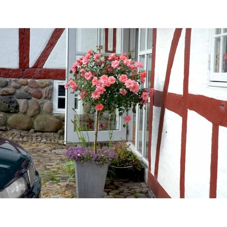 Laksefarvet til koralrosa. Middelstor og halvfyldt blomst med let duft. 10-25 kronblade. 7-9 cm i diameter.