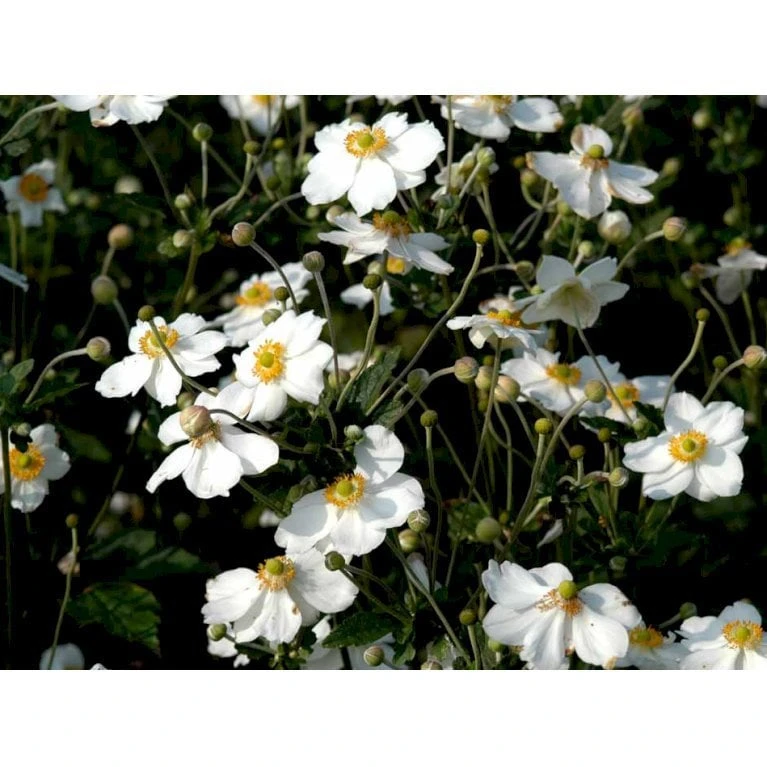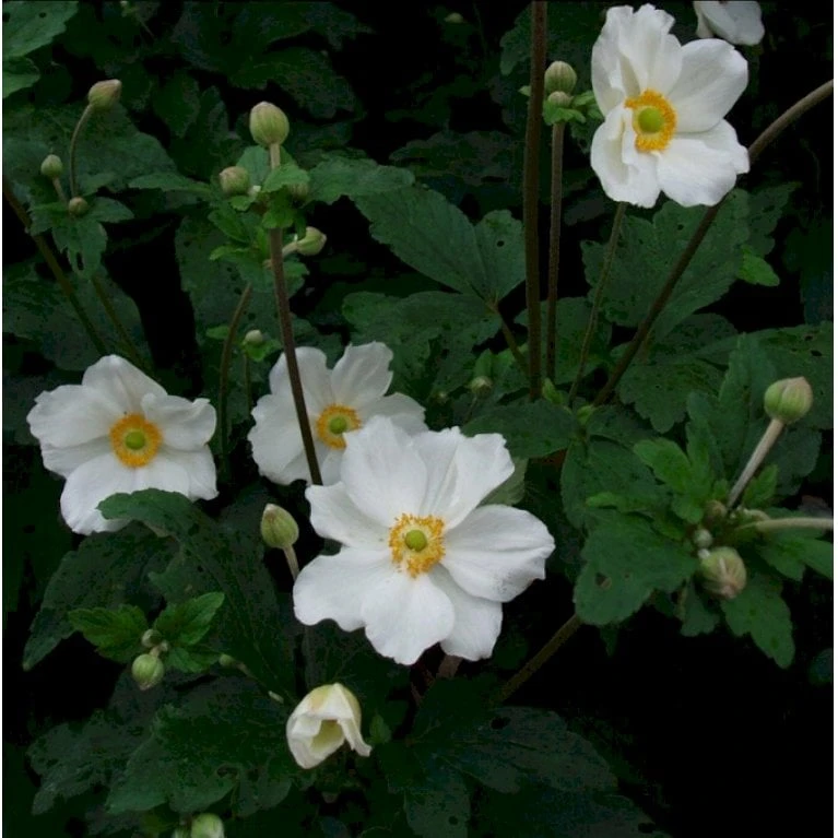 August- oktober. Meget store rent hvide anemoneblomster på lange tynde stilke over det fligede løv.