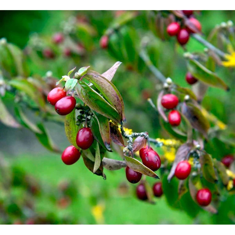 Ovale orangerøde stenfrugter af størrelse som kirsebær. Frugterne er spiselige, syrlige og anvendes undertiden til marmelade. Ellers spises de med glæde af havens fugle.