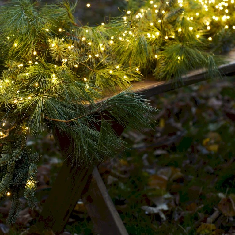 Lyskæden består af en kobberledning, som er belagt af naturtro, grøn plastik, der gør det nemt at skjule ledningen plant planter og blade.