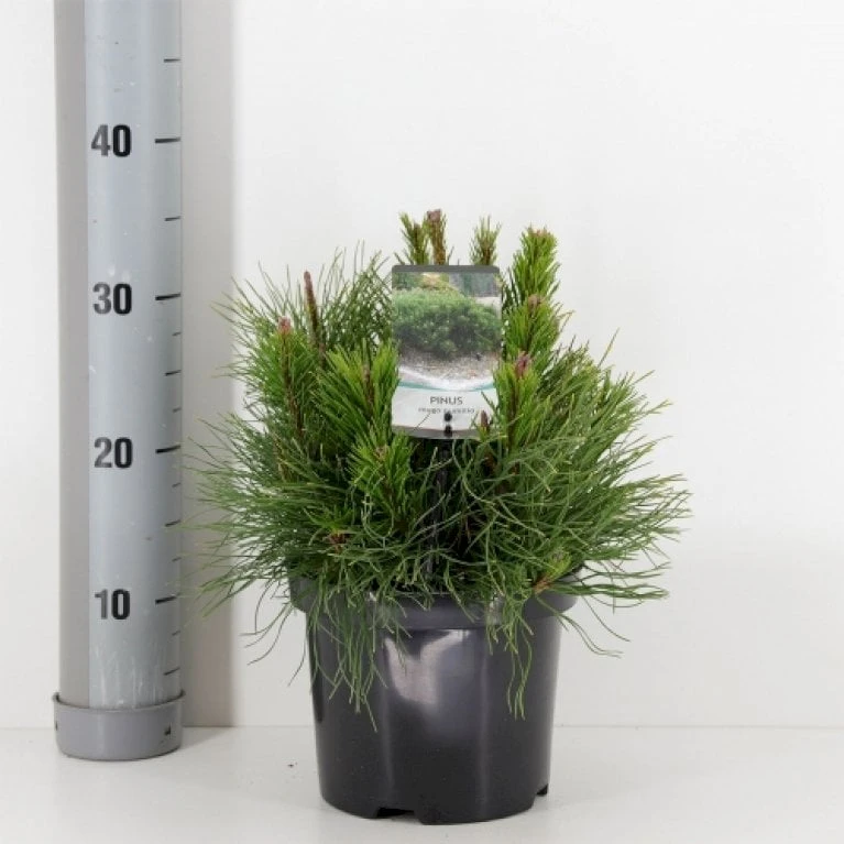 Lav, flerstammet, tæt, buskagtig fyr. Udpræget nedliggende, bred vækst. Nåleknipper, 2-nålede, mørkegrønne. Trives i sol – let skygge. Kogler symmetriske, blålige 2-4 cm store. Bliver under normale forhold omkring 0,5 – 1 m høj og 90 – 120 cm bred. Planten er middeltvoksende. velegnet i bunddækkende beplantninger, placeres i sol / halvskygge. Kræver mellem gødning og er fuldt ud hårdfør under danske forhold.