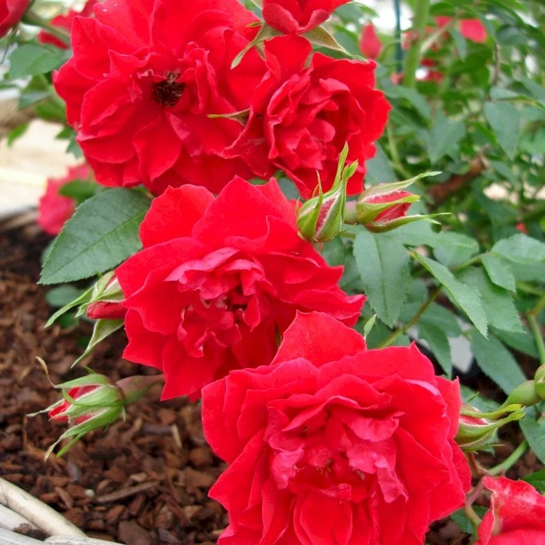 Små, godt fyldte røde blomster, 15-25 kronblade. 5-8 cm. i diameter. Let eller ingen duft.