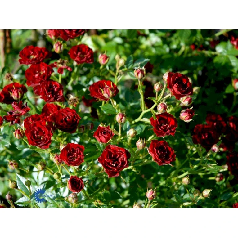 Rent røde, halvfyldte blomster med let duft. 10-25 kronblade. 5-7 cm i diameter.