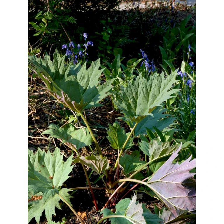 Store, udbredte og vifteformede grønne blade med dybe indskæringer i bladranden. Nye blade røde, fuldt udfoldede blade er grønne. IKKE SPISELIG!