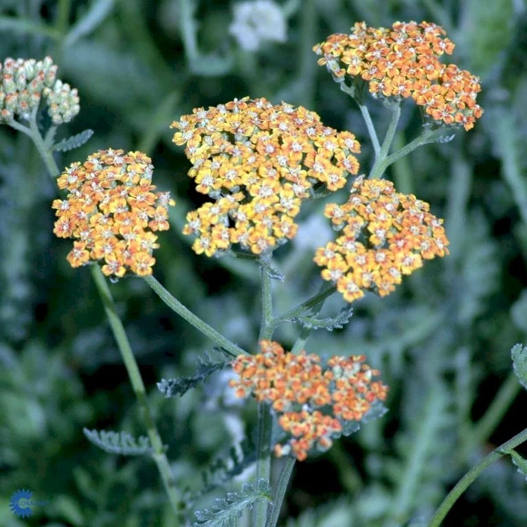 Juni-august. Store flade stande, hver bestående af mange små blomster som veksler i toner af orangegul.