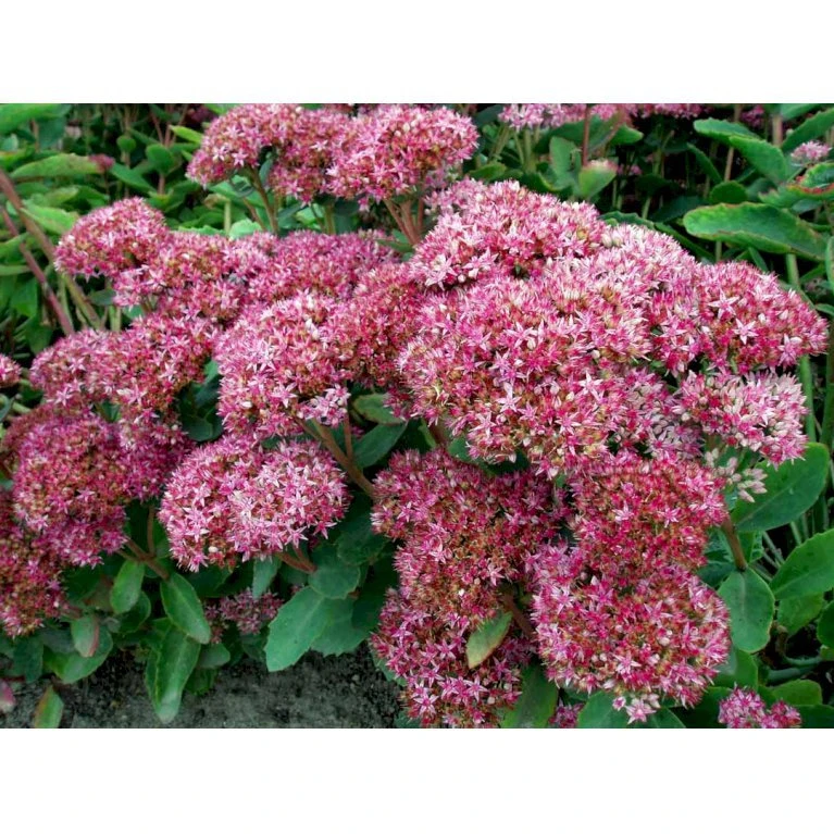 August – oktober. Meget store flade stande, bestående af mange små mørkrosa til pink blomster.