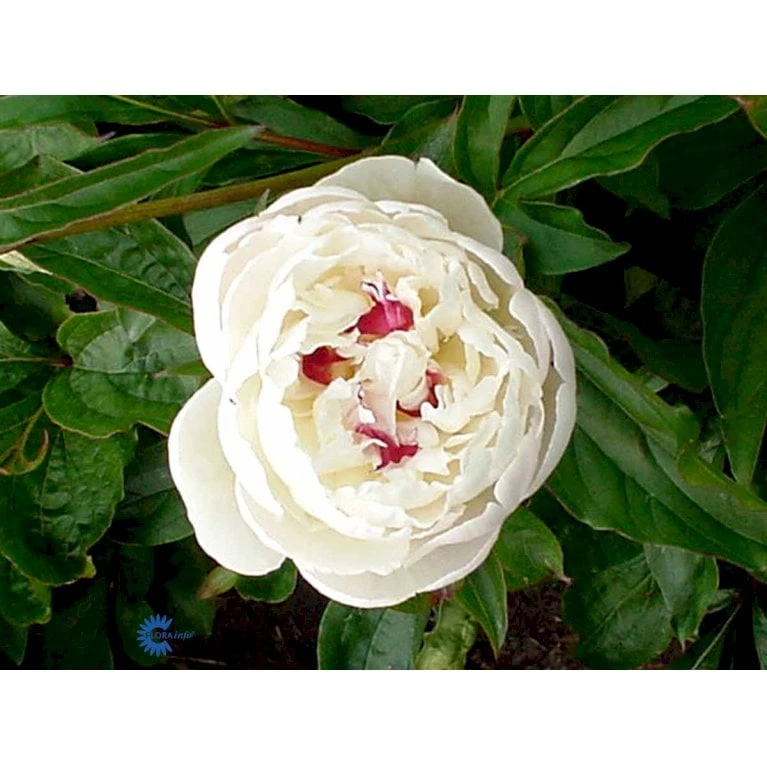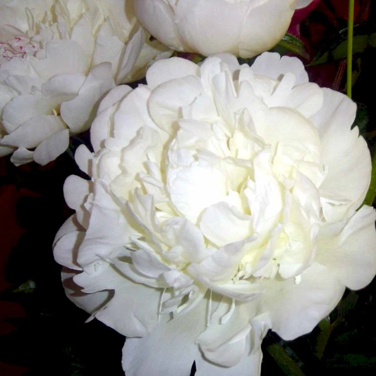 Juni -juli. Store, stærkt fyldte, velduftende hvide blomster med enkelte mørkerøde strejf.