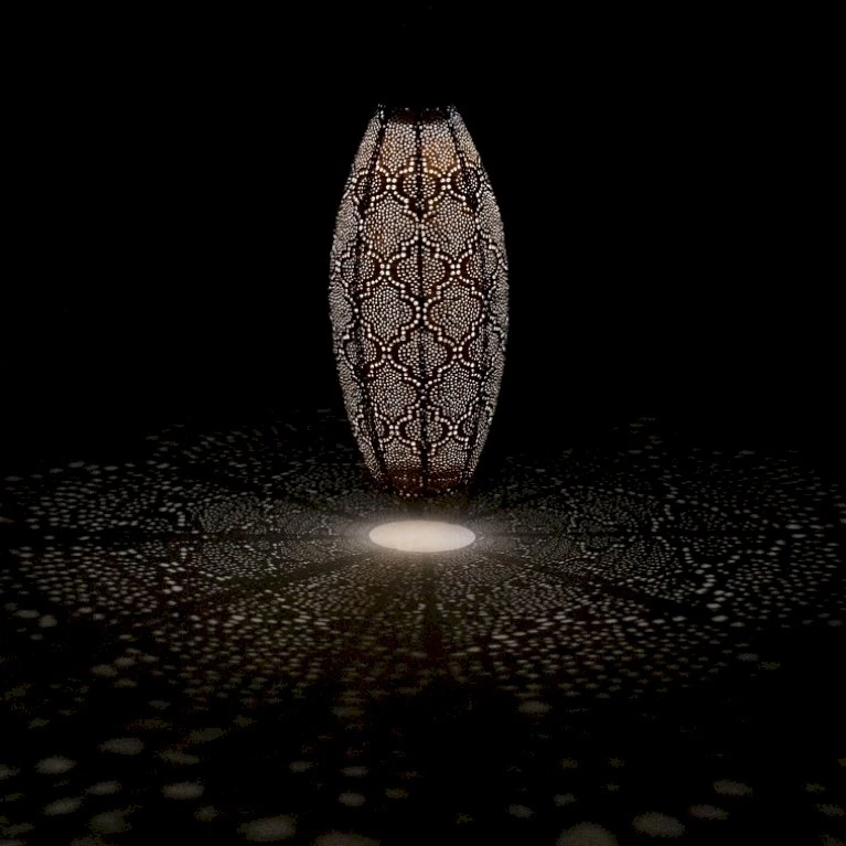 Lumiz solcelle lanterne lang oval 20 cm i kobber med mønsteret ’Bazaar’, kan give et unikt og royalt look til din have eller din terrasse.