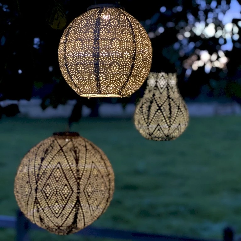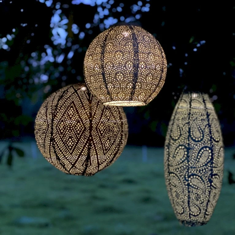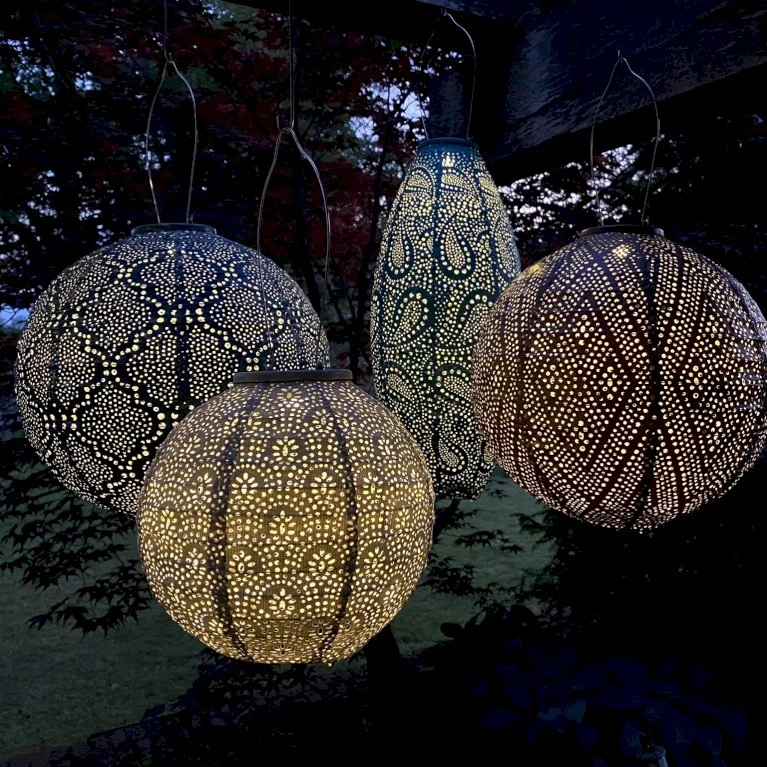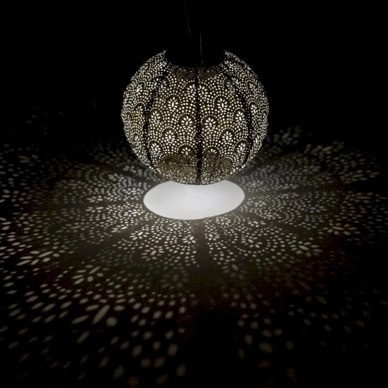 Lanternen har et varmt LED lys, der spreder sig rundt omkring lanternen i det flotte mønster.