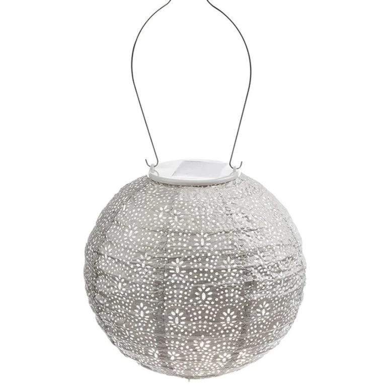 Lumiz solcelle lanterne rund 20 cm i lysegrå med mønsteret ’Fan’, er en smuk lanterne til haven.