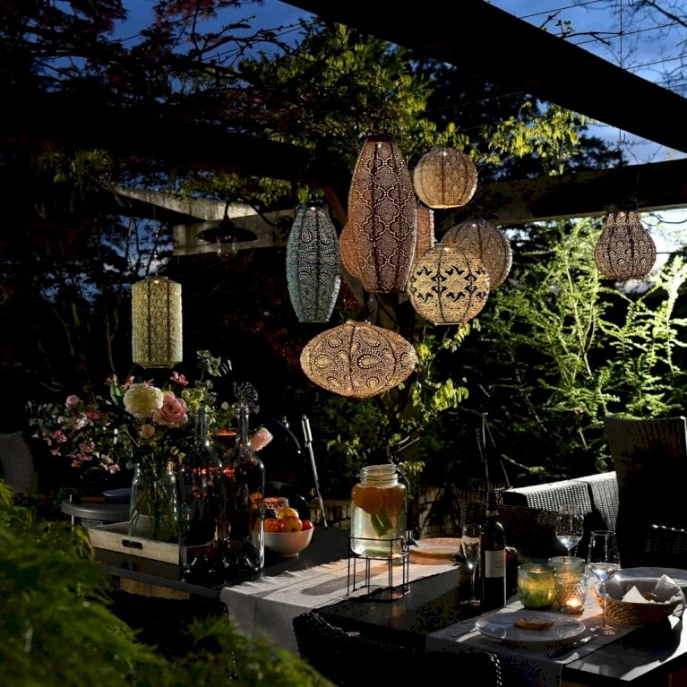 Lanternes varme LED lys kaster et flot mønster rundt om sig på stole, borde og planter.