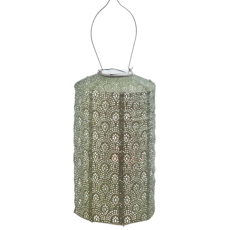 Lumiz solcelle lanterne cylinder 18 cm i lysegrøn med mønsteret ’Fan’, kan give et flot naturligt look til din terrasse og kan smukt hænges ved blomsterne så de bliver belyst i nattetimerne.