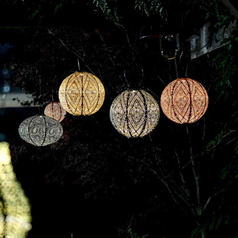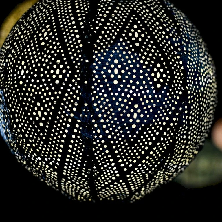 Lumiz solcelle lanterne rund 30 cm i mørkeblå med mønsteret ’Ikat’, vil kunne stå i flot kontrast til dine lysfarvet blomster i haven eller på terrassen.