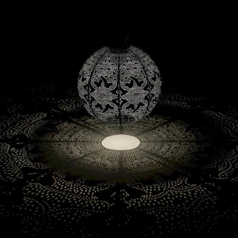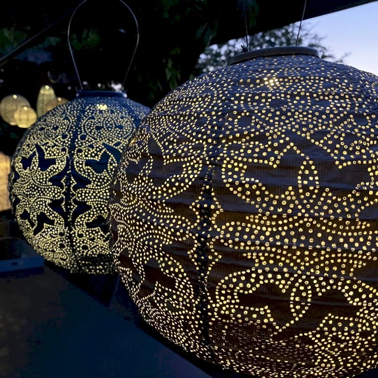 Lumiz solcelle lanterne rund 30 cm i grå med mønsteret ’Marrakesh’, vil give din have eller din terrasse en unik og flot belysning.