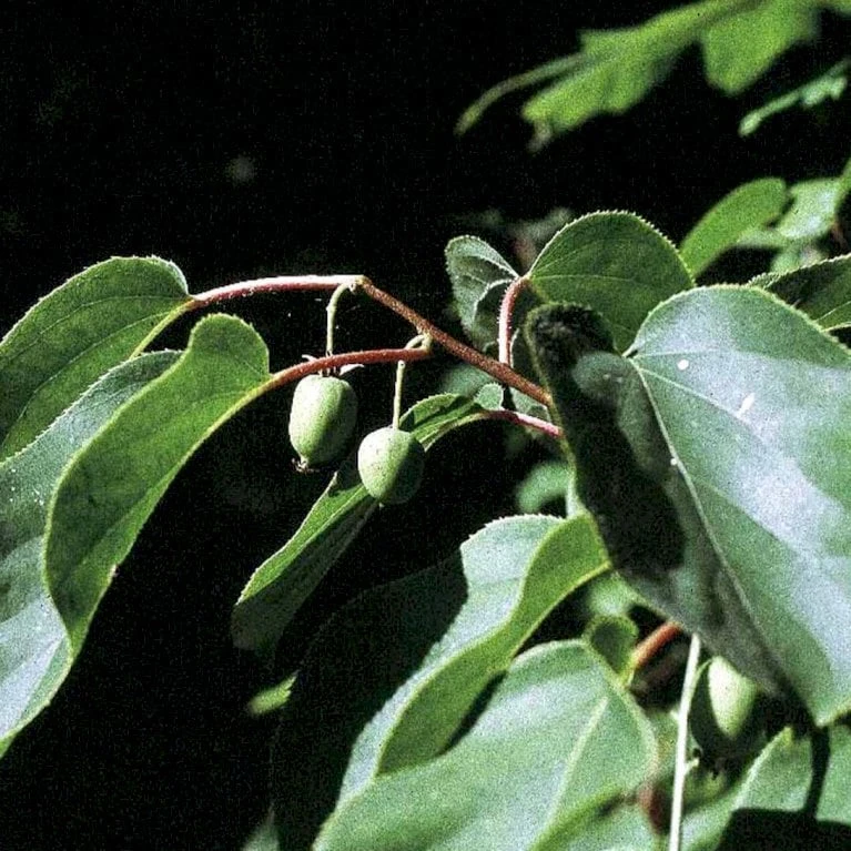 Kraftigt slyngende plante, med hvide blomstrer i juni- juli. Frugterne er små og hårløse , men ligner ellers frugterne fra alm. kiwi.