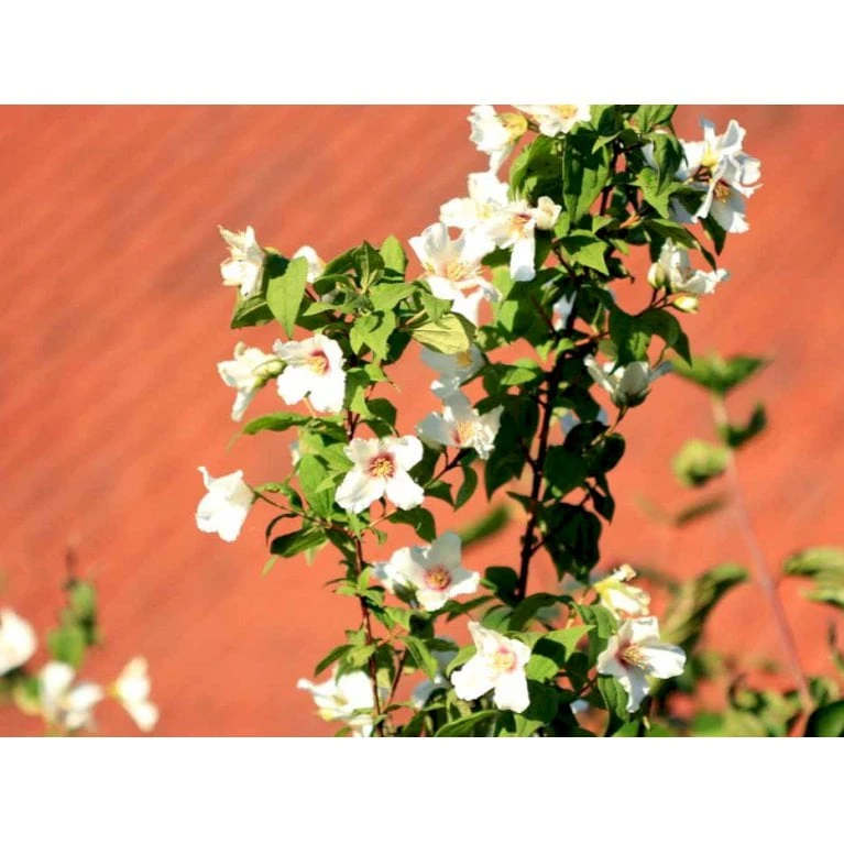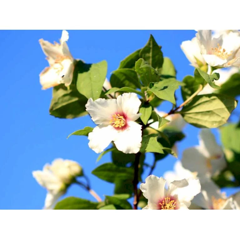 Meget rig blomstring. Blomsterne er hvide og ganske store, hver med et rosa “øje” i blomstens midte.